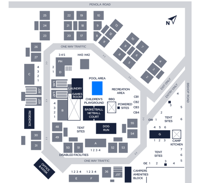 Planning your stay is even easier with our detailed site map! Whether you’re booking a cabin, pitching a tent, or arriving in your caravan, our clearly marked layout helps you quickly find your way around. From powered and unpowered sites to deluxe cabins, BBQ areas, the camp kitchen, swimming pool, and recreation zones — everything is conveniently located and easy to access.